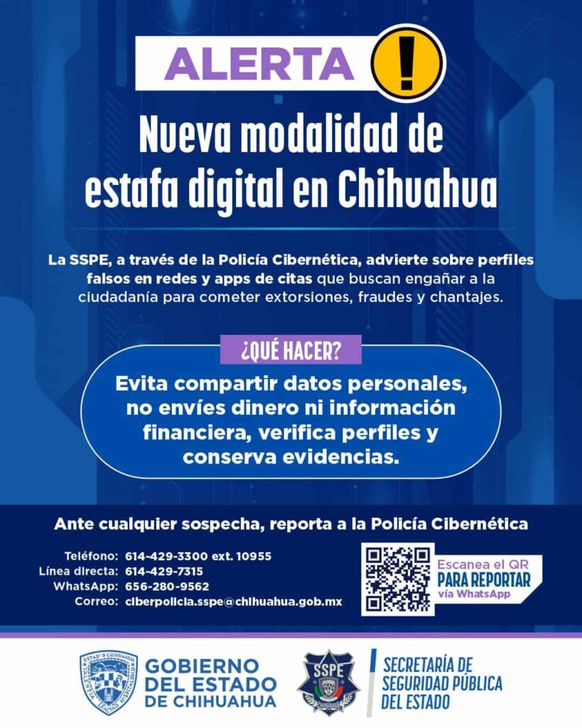 La SSPE advierte sobre estafas digitales en Chihuahua, donde delincuentes utilizan perfiles falsos en redes sociales para extorsionar a las víctimas. Se emiten recomendaciones de prevención.