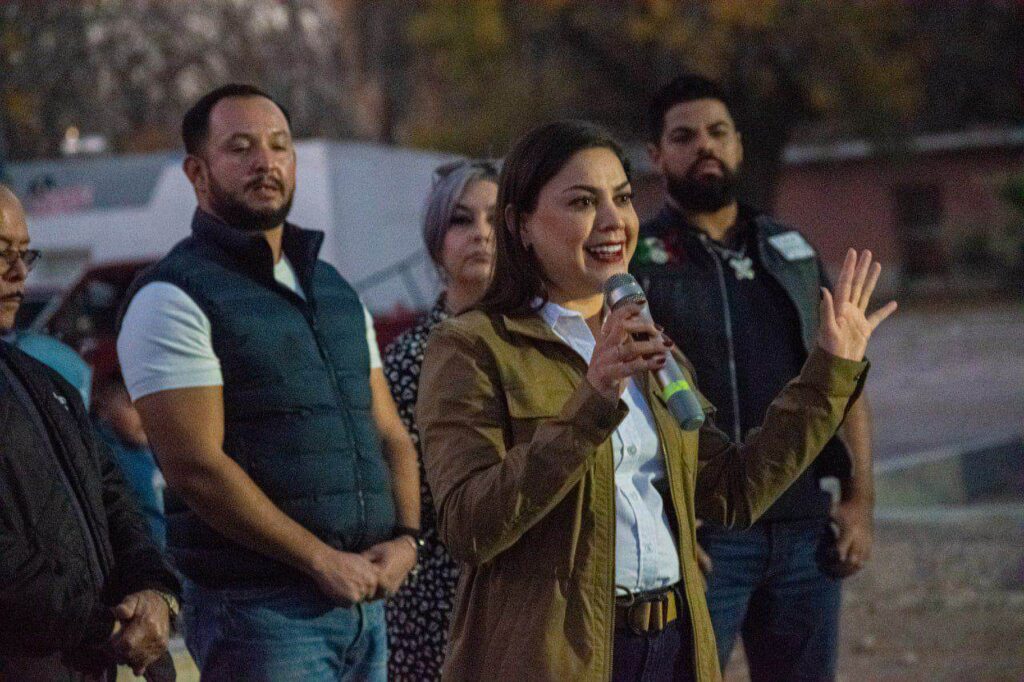 La alcaldesa de Meoqui, Miriam Soto, lideró la posada navideña y el encendido del pino en Nuevo San Lucas, destacando el trabajo comunitario y los avances en infraestructura.