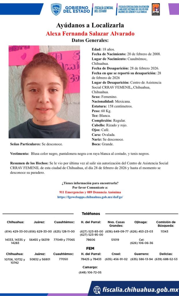 Alexa Fernanda Salazar Alvarado, una joven de 18 años, desapareció el 28 de febrero de 2026 en Chihuahua. La última vez que fue vista, salió sin autorización de un centro de asistencia social.