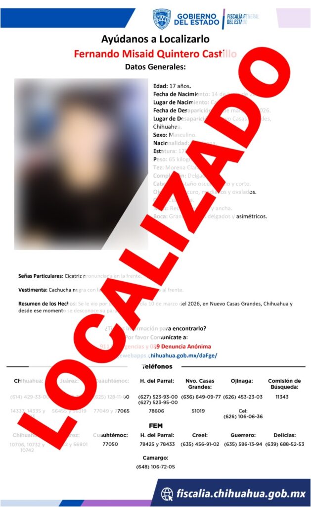 Agentes de la AEI localizaron a un menor de 17 años que había desaparecido en Nuevo Casas Grandes. El adolescente fue revisado y se determinó que no había sido víctima de ningún delito.