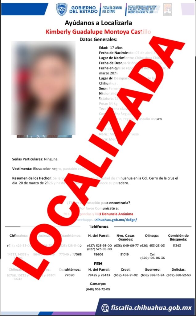 La Fiscalía Especializada en Atención a Mujeres y la Familia confirma la localización de K.G.M.C., quien había desaparecido el 20 de marzo. La adolescente indica que su ausencia fue voluntaria.