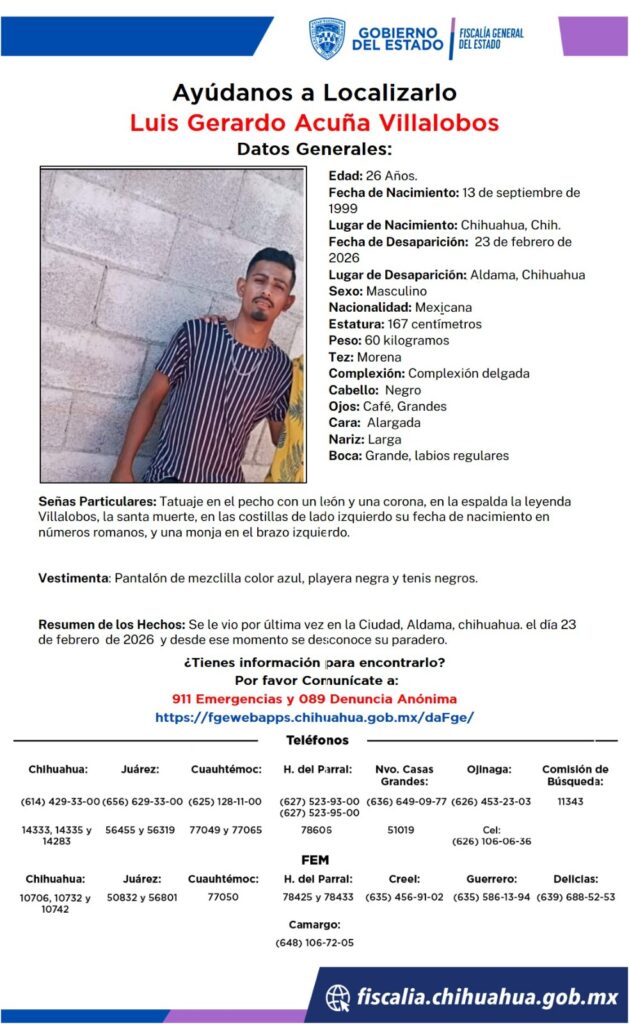 Luis Gerardo Acuña Villalobos, de 26 años, desapareció el 23 de febrero de 2026 en Aldama, Chihuahua. Se busca ayuda para dar con su paradero.
