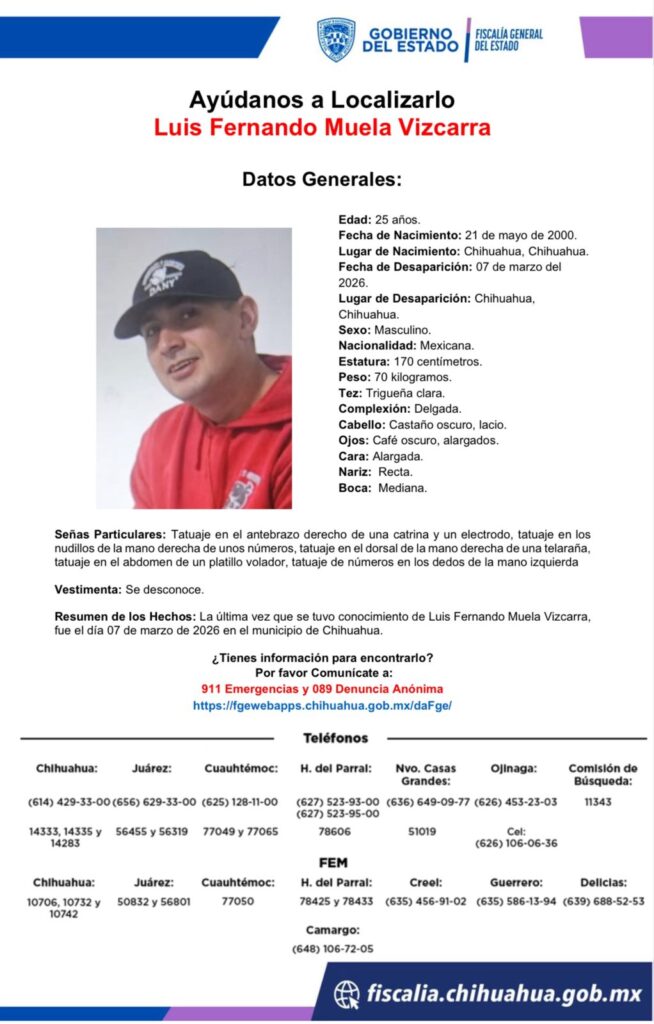 Luis Fernando Muela Vizcarra, de 25 años, desapareció el 7 de marzo de 2026 en Chihuahua. Se solicitan pistas para su localización.