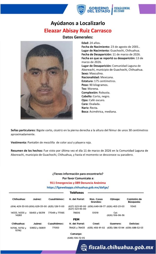Eleazar Abisay Ruiz Carrasco, un joven de 24 años, desapareció el 11 de marzo de 2026 en Laguna de Aboreachi, Chihuahua. Autoridades locales buscan información sobre su paradero.