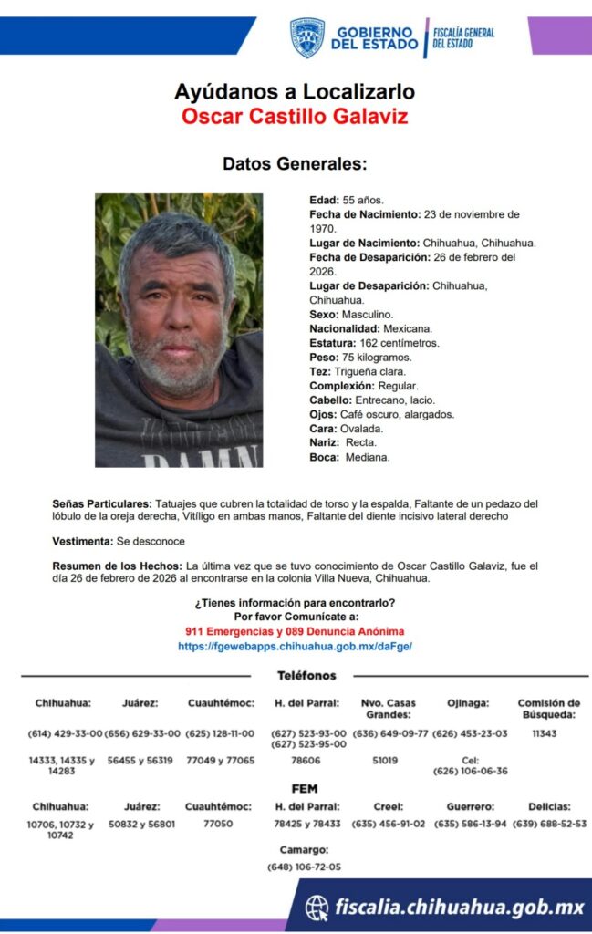 Oscar Castillo Galaviz, de 55 años, desapareció en Chihuahua el 26 de febrero de 2026. Se solicita la colaboración de la ciudadanía para obtener información sobre su paradero.
