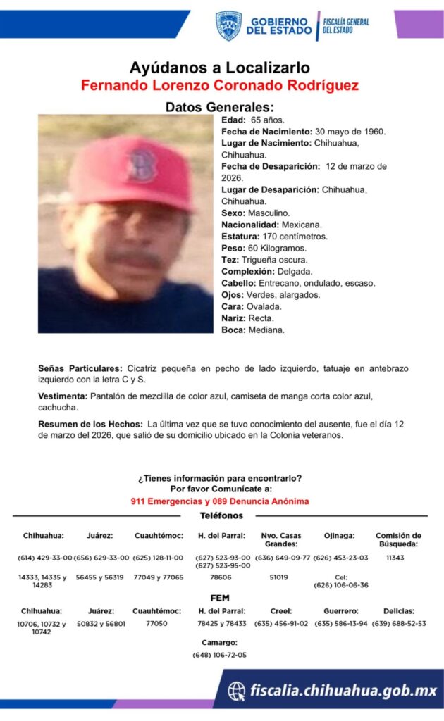Fernando Lorenzo Coronado Rodríguez, un hombre de 65 años, fue visto por última vez el 12 de marzo de 2026 en la Colonia Veteranos de Chihuahua. Se solicita la colaboración de la población para su localización.