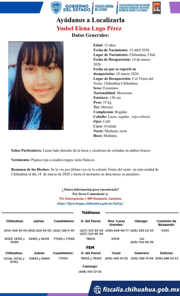 Danna Estefanía Baylon Jasso, de 16 años, desapareció el 18 de marzo de 2026 en la colonia Camino Real de Chihuahua. Las autoridades solicitan la colaboración de la ciudadanía para localizarla.