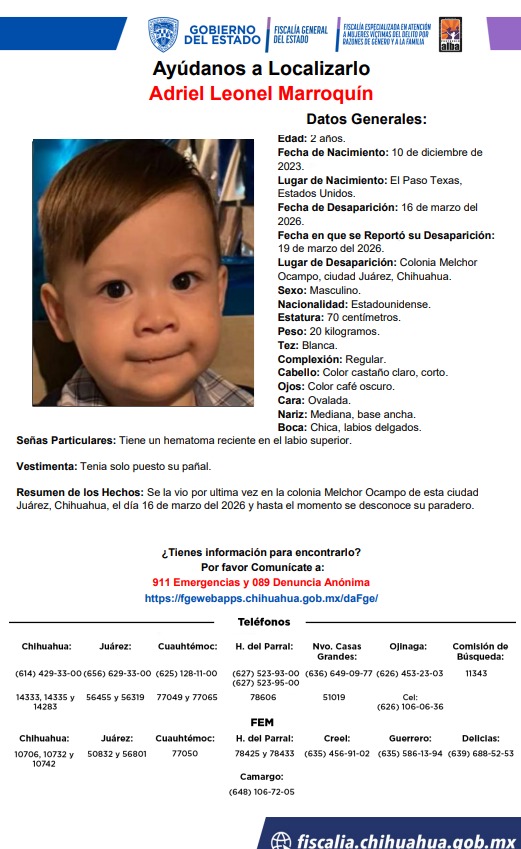 Adriel Leonel Marroquín, un niño de 2 años, fue reportado como desaparecido el 19 de marzo de 2026 en la colonia Melchor Ocampo, ciudad Juárez. Las autoridades piden la colaboración de la comunidad para dar con su paradero.