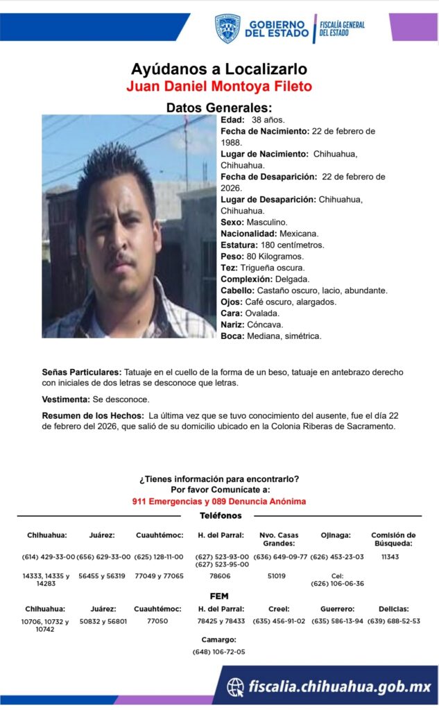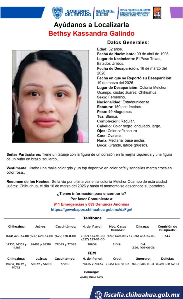 Betsy Kassandra Galindo, de 32 años, fue reportada como desaparecida el 19 de marzo de 2026 tras haber sido vista por última vez el 16 de marzo en la colonia Melchor Ocampo, Ciudad Juárez.