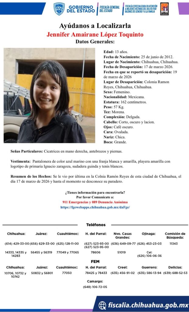 Activa búsqueda de Jennifer Amairane López Toquinto, desaparecida en Chihuahua