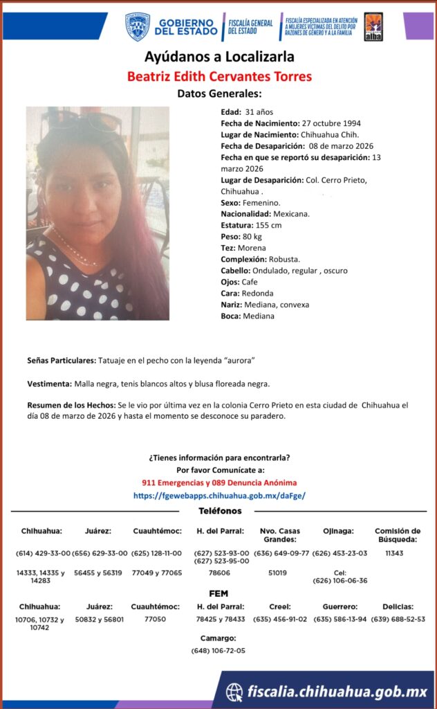 Beatriz Edith Cervantes Torres, de 31 años, desapareció el 08 de marzo de 2026 en la colonia Cerro Prieto, Chihuahua. Se solicita la colaboración de la ciudadanía para obtener información sobre su paradero.