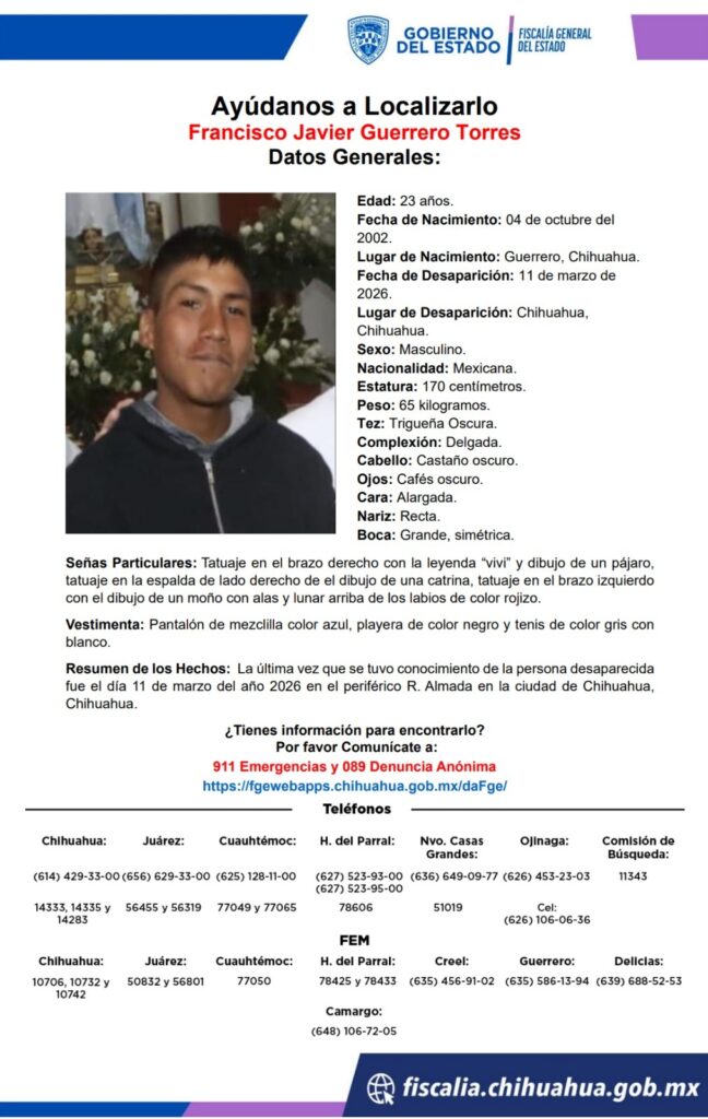 Francisco Javier Guerrero Torres, de 23 años, desapareció el 11 de marzo de 2026 en Chihuahua. Se busca información que ayude a encontrarlo.