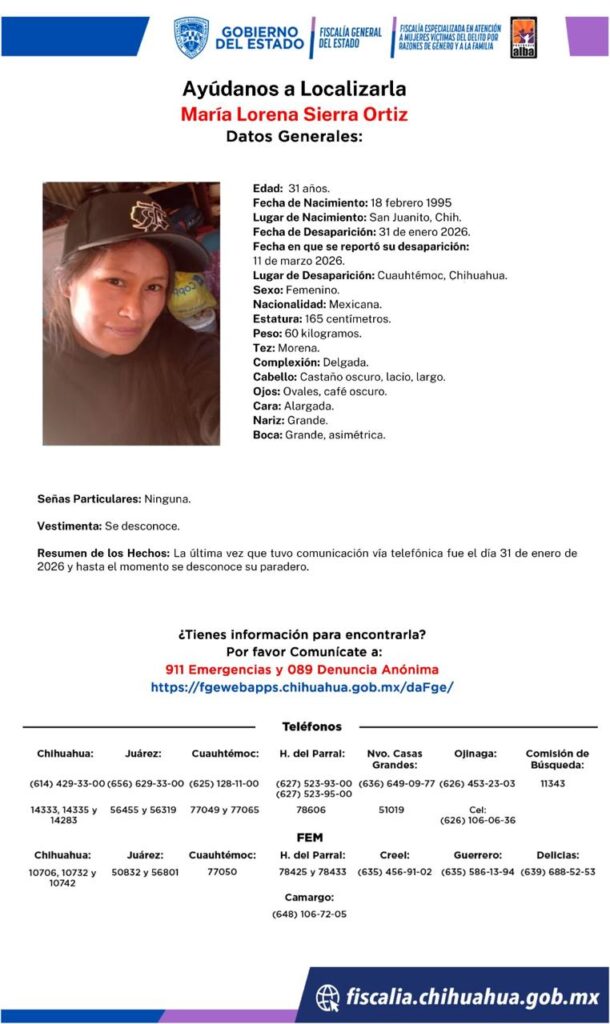 María Lorena Sierra Ortiz, de 31 años, desapareció el 31 de enero de 2026 en Cuauhtémoc, Chihuahua. Se solicita la colaboración de la ciudadanía para localizarla.