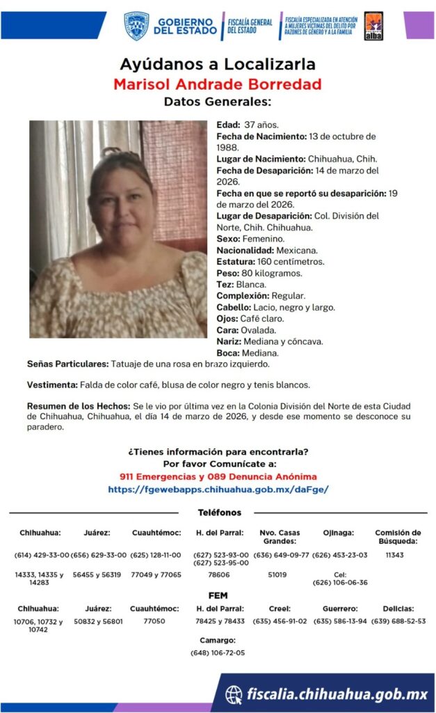 Marisol Andrade Borredad, una mujer de 37 años, desapareció el 14 de marzo de 2026 en la Colonia División del Norte, Chihuahua. Su familia solicita apoyo para encontrarla.