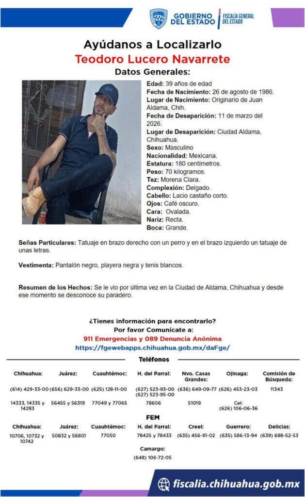 Teodoro Lucero Navarrete, de 39 años, desapareció el 11 de marzo de 2026 en Ciudad Aldama, Chihuahua. Las autoridades solicitan información para dar con su paradero.