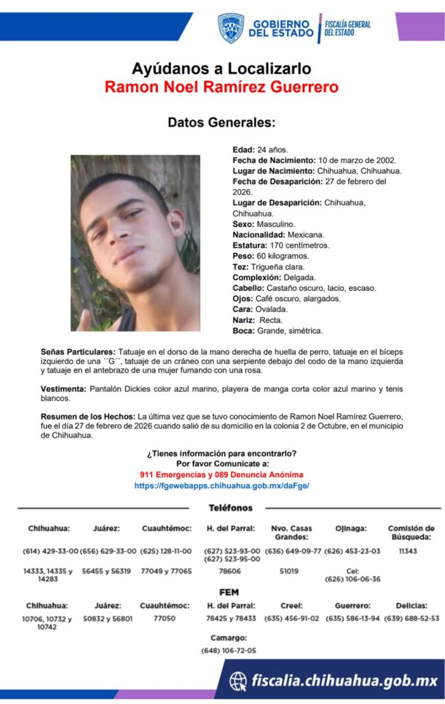 Ramón Noel Ramírez Guerrero, de 24 años, desapareció el 27 de febrero de 2026 en Chihuahua. Se solicita la colaboración de la ciudadanía para su localización.
