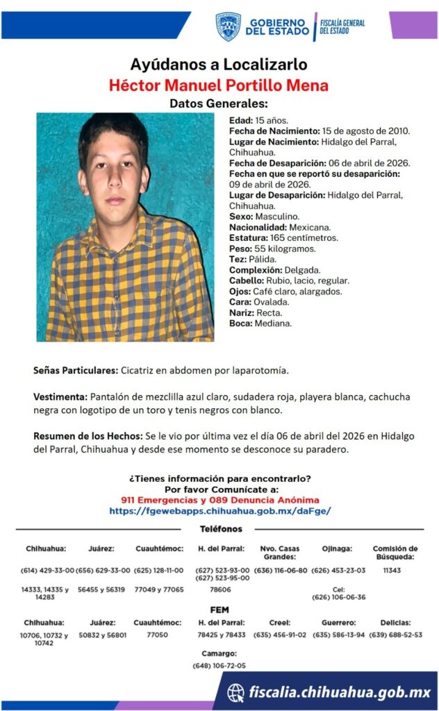 Héctor Manuel Portillo Mena, de 15 años, desapareció el 6 de abril de 2026 en Hidalgo del Parral, Chihuahua. Las autoridades piden la colaboración de la ciudadanía para localizarlo.