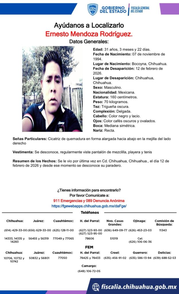 Ernesto Mendoza Rodríguez, de 31 años, fue reportado como desaparecido el 12 de febrero de 2026 en la ciudad de Chihuahua. Nacido el 7 de noviembre de 1994 en Bocoyna, presenta características físicas que incluyen una estatura de 160 centímetros, peso de 70 kilogramos, tez trigueña oscura, cabello negro y lacio, y ojos cafés oscuros. Además, tiene una cicatriz de quemadura en la mejilla del lado derecho.