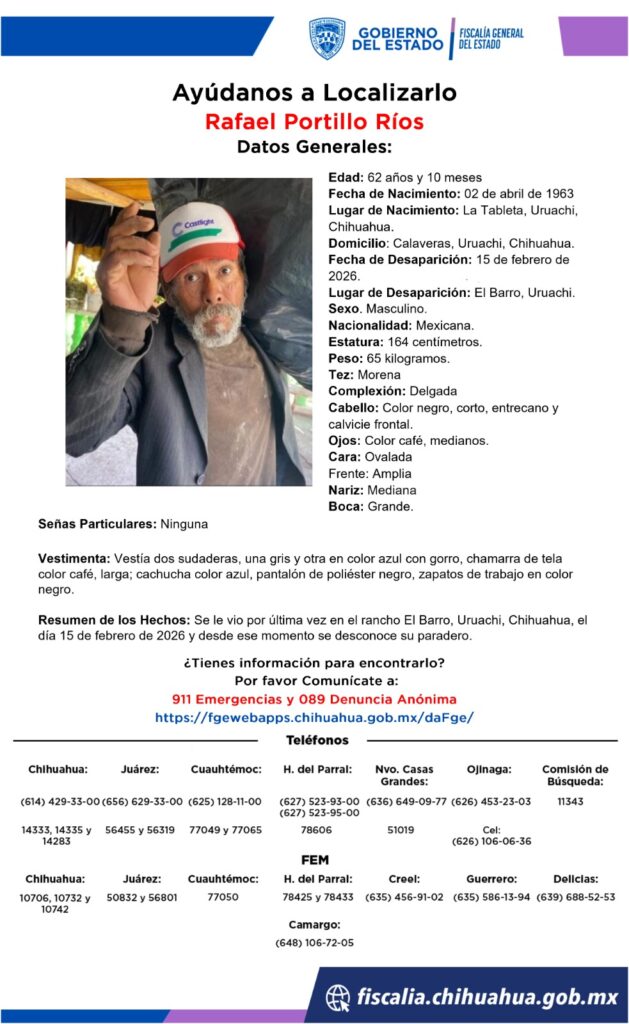 Rafael Portillo Ríos, de 62 años, fue visto por última vez en el rancho El Barro, Uruachi, Chihuahua, el 15 de febrero de 2026. Desde entonces, su paradero es desconocido.