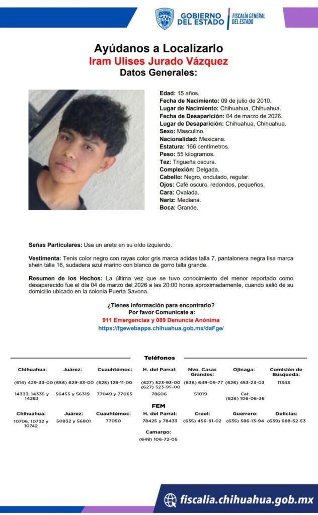 Buscan a Iram Ulises Jurado Vázquez, menor desaparecido en Chihuahua