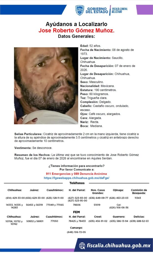 Jose Roberto Gómez Muñoz, un hombre de 52 años originario de Saucillo, Chihuahua, es reportado como desaparecido desde el 7 de enero de 2026. La última vez que se tuvo contacto con él fue en Aquiles Serdán, Chihuahua.