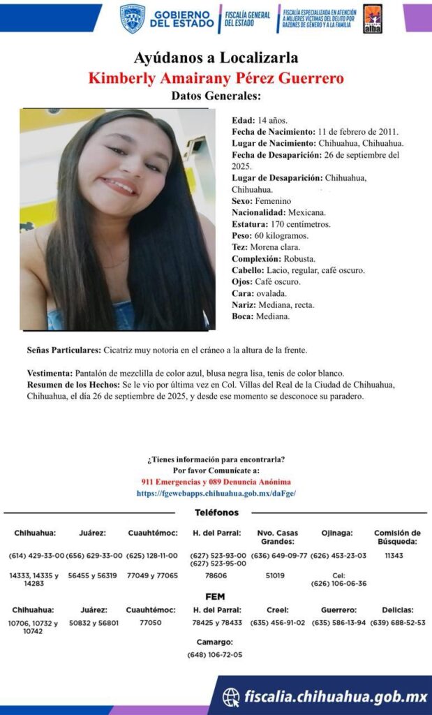 La Fiscalía General del Estado activó una pesquisa para localizar a Kimberly Amairany Pérez Guerrero, adolescente de 14 años de edad, reportada como desaparecida en la ciudad de Chihuahua.