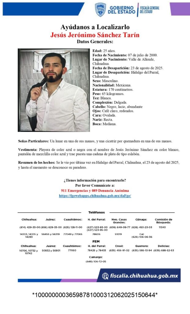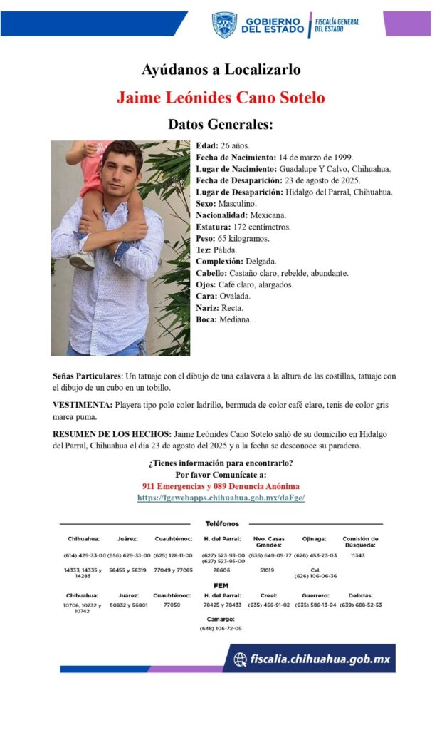 La Fiscalía de Distrito Zona Sur, a través de la Unidad Especializada en Investigación de Personas No Localizadas y Desaparecidas, continúa con los trabajos de búsqueda para dar con el paradero de Jaime Leónides Cano Sotelo y Jesús Jerónimo Sánchez Tarín, reportados como desaparecidos el 23 de agosto en la ciudad de Parral.