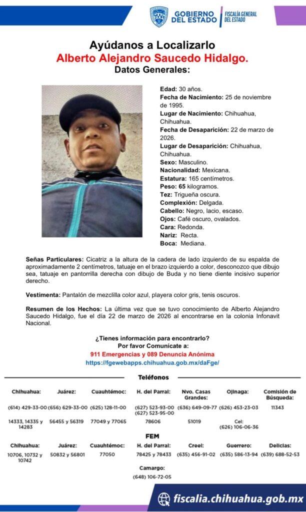 Alberto Alejandro Saucedo Hidalgo, un hombre de 30 años, fue reportado desaparecido el 22 de marzo de 2026 en la colonia Infonavit Nacional de Chihuahua, Chihuahua.