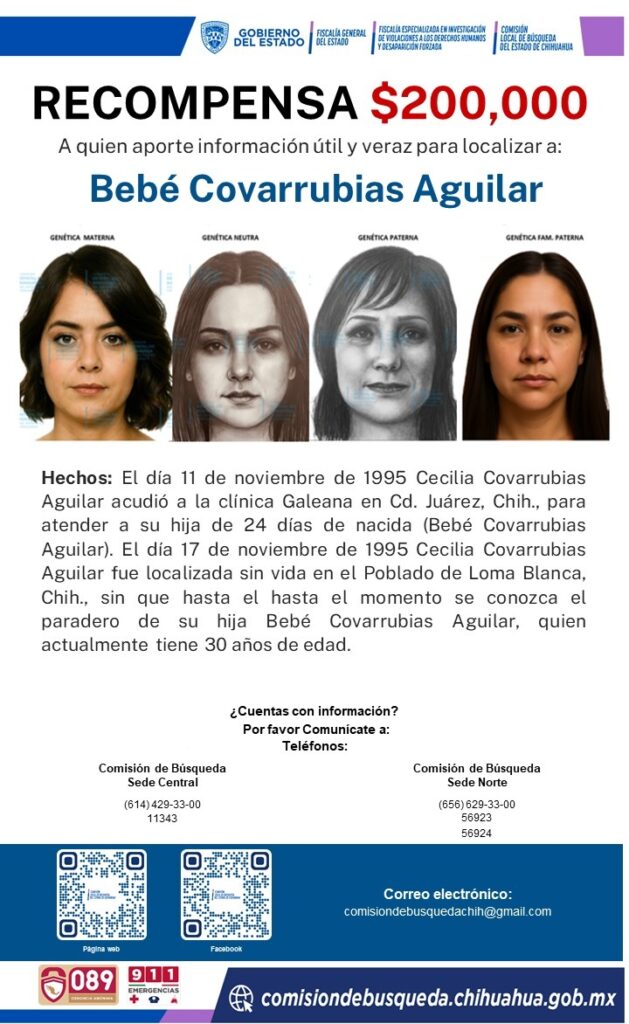 La Comisión Local de Búsqueda de Chihuahua ha confirmado que sigue activas las acciones para localizar a la bebé Covarrubias Aguilar, quien desapareció en 1995. Este año marca el 30 aniversario de la desaparición de la adolescente Cecilia Covarrubias Aguilar y su hija.