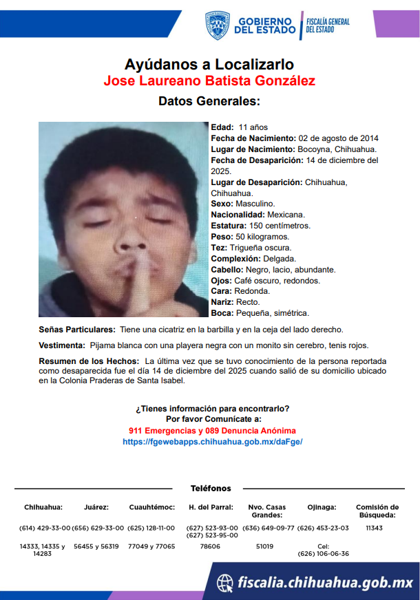 José Laureano Batista González ha sido reportado como desaparecido en Chihuahua. Las autoridades están llevando a cabo las investigaciones pertinentes para dar con su paradero. Se hace un llamado a la ciudadanía para que brinde cualquier información que pueda ayudar en su búsqueda.