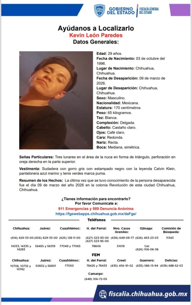 Kevin León Paredes, un hombre de 29 años, ha sido reportado como desaparecido en la ciudad de Chihuahua. Su desaparición ocurrió el 9 de marzo de 2026, específicamente en la colonia Revolución.