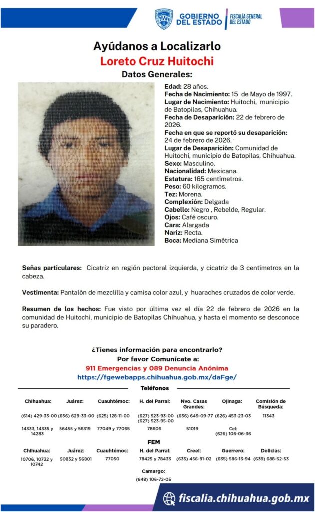 Loreto Cruz Huitochi, de 28 años, fue visto por última vez el 22 de febrero de 2026 en la comunidad de Huitochi, municipio de Batopilas, Chihuahua. El reporte de su desaparición fue realizado dos días después, el 24 de febrero.
