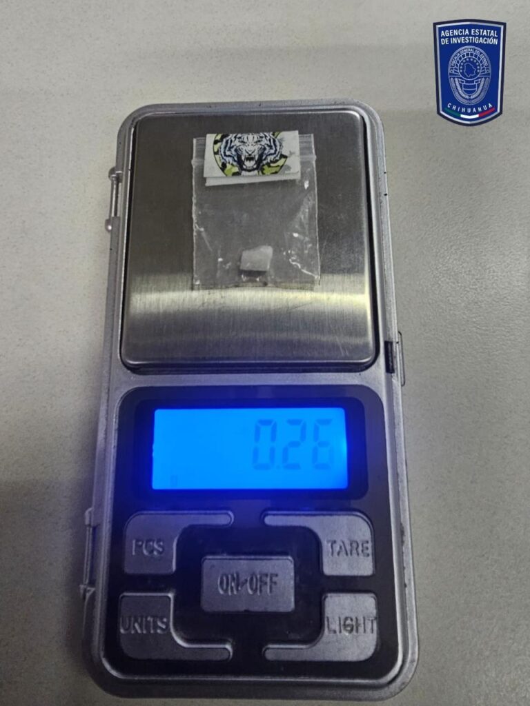 En una intervención adicional, en la calle Daniel Andrade de la colonia Tierra y Libertad, sector B, se detuvo a Giovany Gabriel D. J., de 30 años, quien poseía un envoltorio de plástico que contenía 0.26 gramos de cocaína en piedra, con una etiqueta de un tigre blanco.