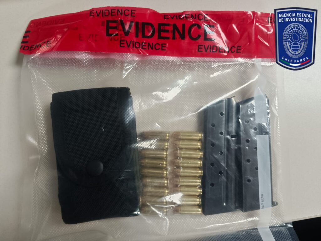 Los agentes de la Agencia Estatal de Investigación, junto con elementos de la Dirección de Seguridad Pública Municipal, aseguraron a Elvis Alan un arma Colt super 38 automática calibre .38mm, con un cargador que contenía nueve cartuchos. Además, se le incautaron dos cargadores metálicos adicionales, también de la marca Colt, con un total de 18 cartuchos calibre .38 super.