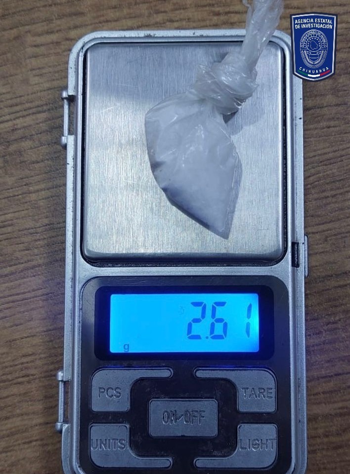 Durante una revisión de sus pertenencias, encontraron un envoltorio de plástico transparente que contenía una sustancia cristalina y granulosa, que pesó 2.61 gramos, correspondería a metanfetamina, comúnmente conocida como cristal.