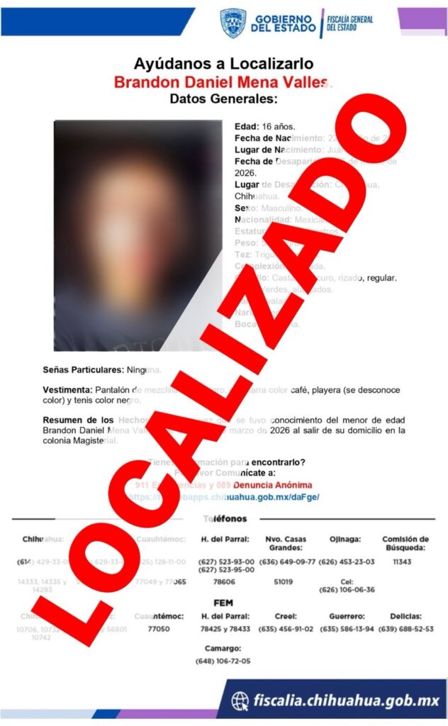 La Unidad de Investigación de Personas Ausentes y/o No Localizadas de la Fiscalía de Distrito Zona Centro (FDZC) localizó al adolescente de iniciales B. D. M. V., de 16 años, quien había sido reportado como ausente en la ciudad de Chihuahua.