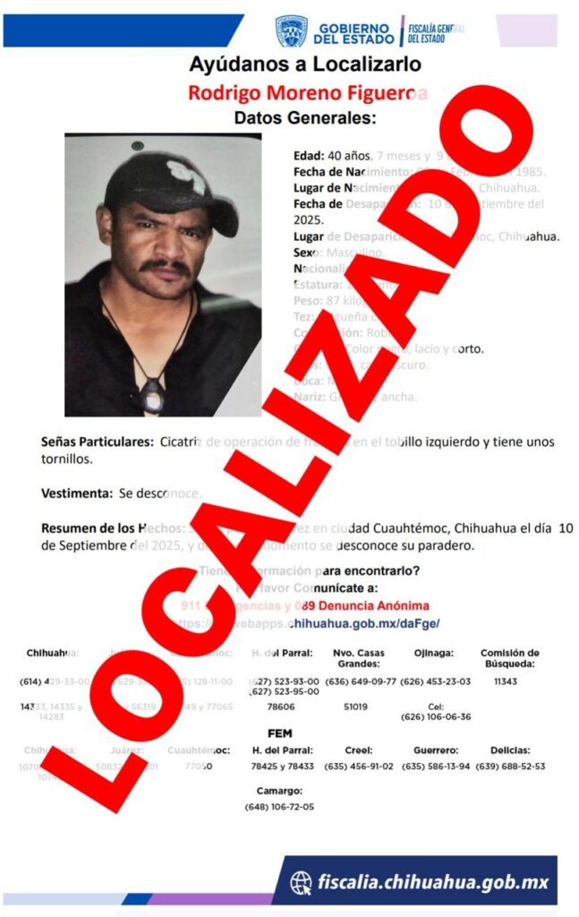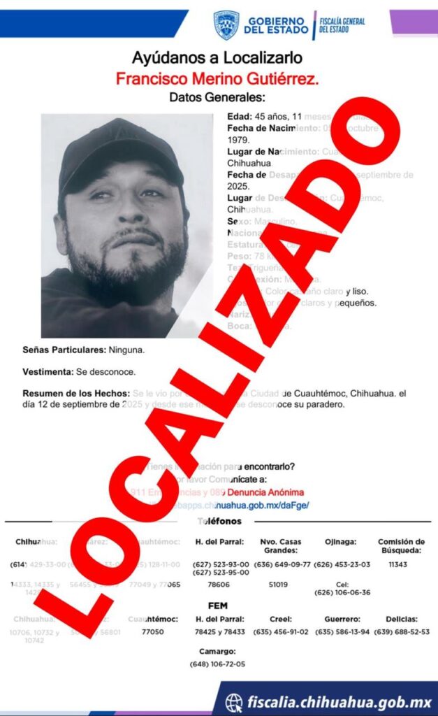 En el primer caso, se localizó en buenas condiciones físicas a Rodrigo M. F., de 40 años de edad, quien salió de su domicilio el pasado 10 de septiembre del 2025 luego de irse a trabajar en una huerta en Bachíniva.