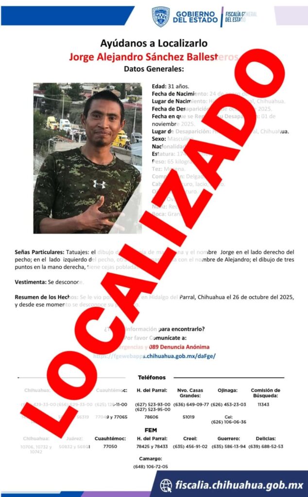 Hidalgo del Parral, Chih.- Mediante la aplicación de los protocolos de búsqueda y el trabajo de investigación ministerial, la Fiscalía de Distrito Zona Sur localizó sano y salvo a Jorge Alejandro S. B., quien tenía reporte de ausencia interpuesto el 01 de noviembre del presente año, en la ciudad de Parral.