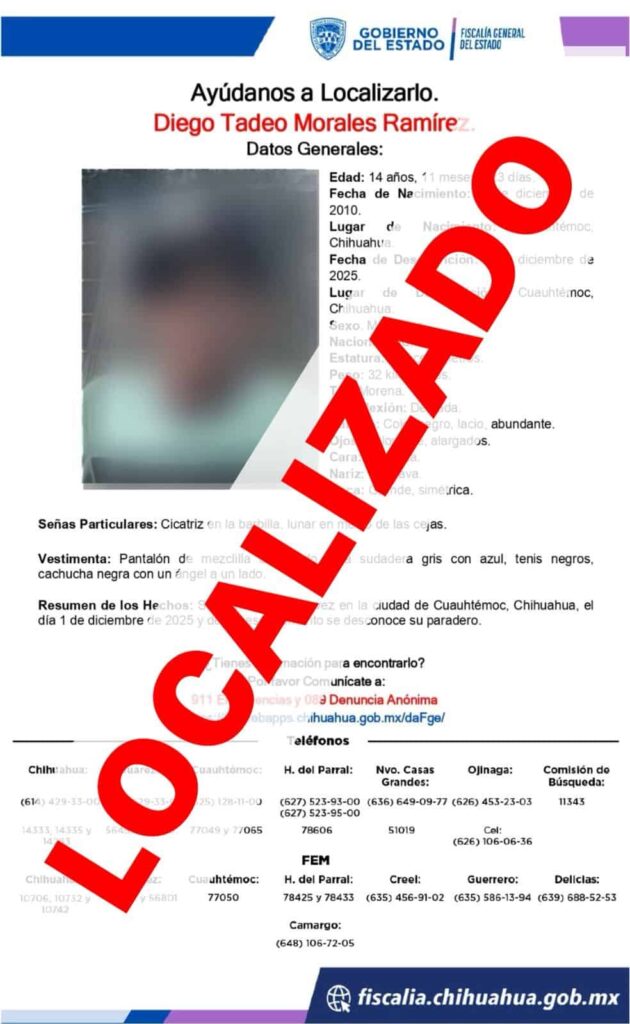 Cuauhtémoc, Chih.- La Fiscalía de Distrito Zona Occidente localizó sano y salvo al adolescente de iniciales D. T. M. R., de 14 años de edad, quien se encontraba ausente desde el 1 de diciembre del año en curso.