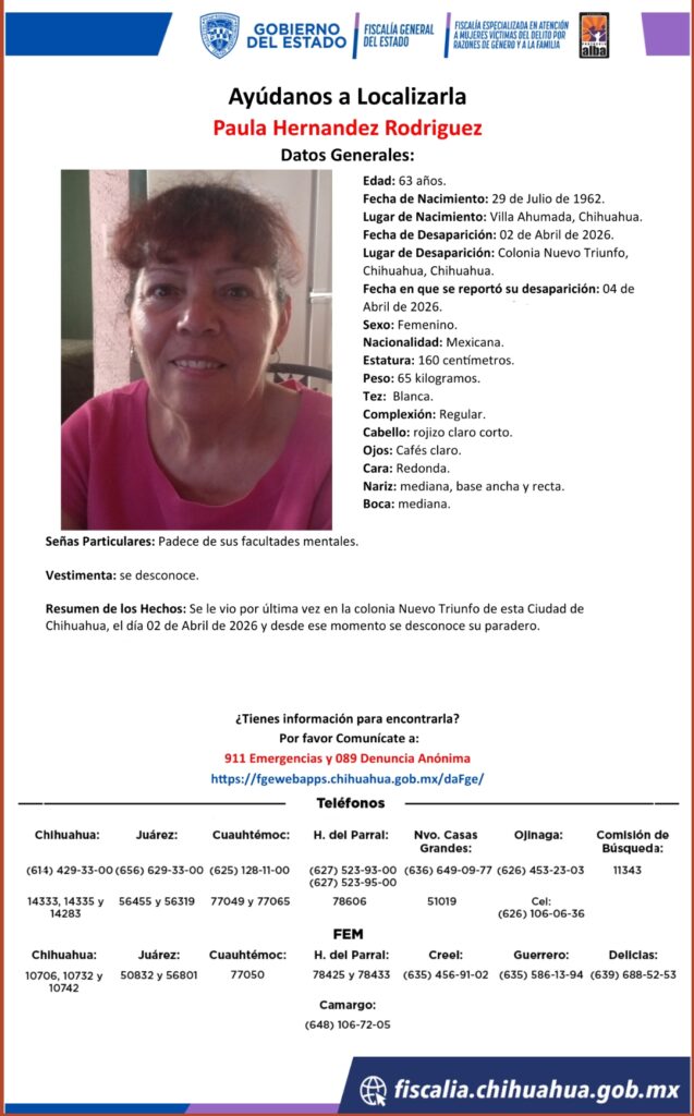 María Concepción Torres Macías, de 86 años, desapareció el 16 de marzo de 2026 en la colonia Infonavit Nacional, Chihuahua. Se solicita la colaboración de la ciudadanía para brindarle información sobre su paradero.