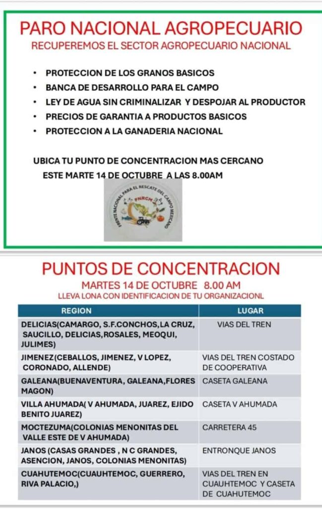 A nivel nacional, se están realizando bloqueos en vías férreas y carreteras, así como la toma de oficinas federales, en demanda de mayor apoyo al campo. En Chihuahua, se reportaron plantones en distintos puntos, incluyendo Delicias, Jiménez, Galeana, Juárez, Moctezuma, Janos y Cuauhtémoc.