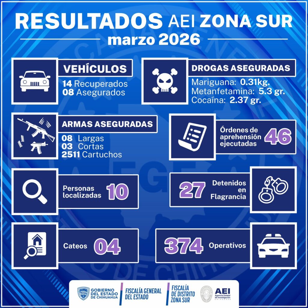 La Agencia Estatal de Investigación (AEI) de la Fiscalía de Distrito Zona Sur ha presentado los resultados operativos correspondientes al mes de marzo, enfocándose en las acciones de investigación y prevención del delito en la región.