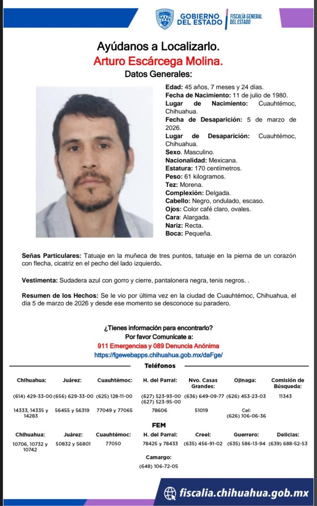 Arturo Escárcega Molina, un hombre de 45 años, desapareció el 5 de marzo de 2026 en Cuauhtémoc, Chihuahua. Desde entonces, su paradero es desconocido.