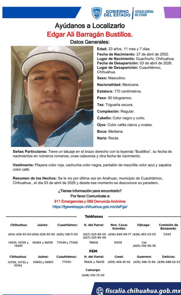 Edgar Ali Barragán Bustillos, un joven de 23 años, fue reportado como desaparecido en Cuauhtémoc, Chihuahua, el 3 de abril de 2026. Nacido el 27 de abril de 2002 en Guachochi, presenta una estatura de 170 centímetros y un peso de 80 kilogramos. Su tez es trigueña oscura y tiene cabello claro y corto, así como ojos de color café claros y oscuros.