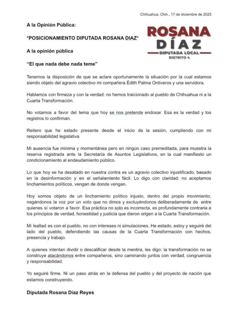 La legisladora morenista Rossana Díaz Reyes defiende su compromiso con la transparencia tras ser señalada por su participación en una votación legislativa en Chihuahua.