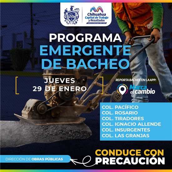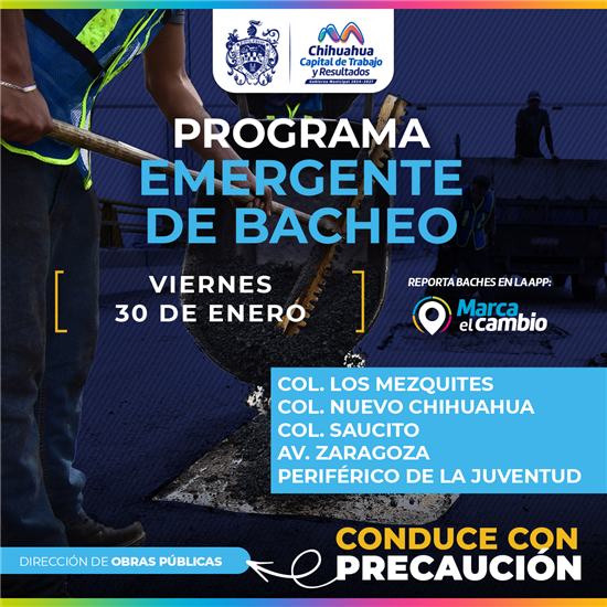 El Gobierno Municipal de Chihuahua realizará trabajos de bacheo en varias colonias y avenidas. Se recomienda a los conductores circular con precaución durante las labores.