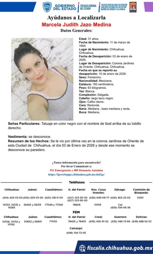 Marcela Judith Jazo Medina, de 31 años, desapareció en Chihuahua. Se busca información sobre su paradero tras ser vista por última vez el 3 de enero de 2026.