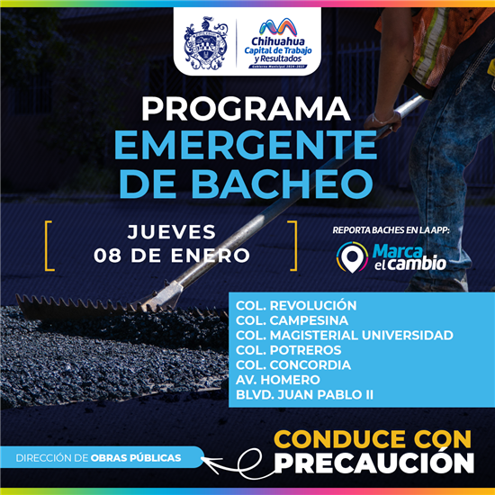 El Gobierno Municipal de Chihuahua realizará trabajos de bacheo en varias colonias. Se recomienda a los conductores circular con precaución durante las labores.