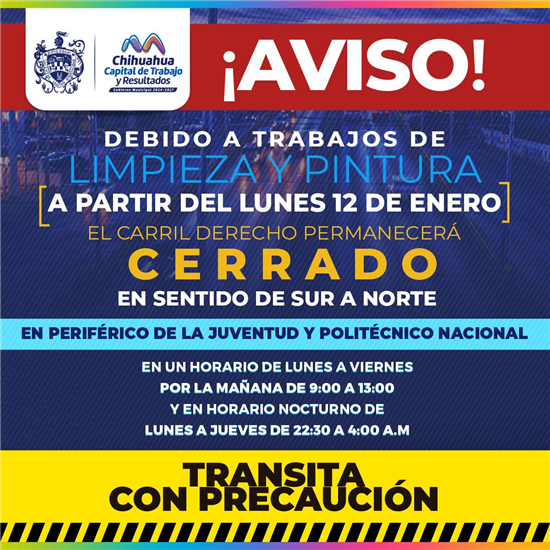 El Municipio de Chihuahua realizará limpieza y pintura en el bajo puente del Periférico de la Juventud del 12 de enero al 6 de febrero. Se cerrará un carril, se recomienda precaución.