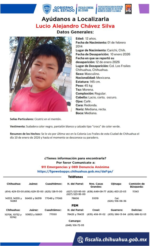 Lucio Alejandro Chávez Silva, un niño de 12 años, desapareció el 10 de enero de 2026 en Chihuahua. Se solicita la colaboración de la comunidad para su localización.